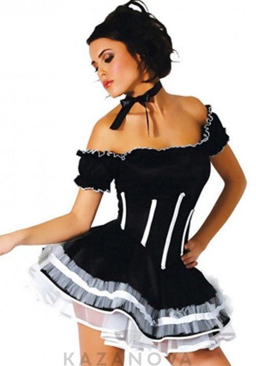 Костюм горничной состоит из обтягивающего платья с открытыми плечиками и пышной юбкой. Подол украшен кружевом.