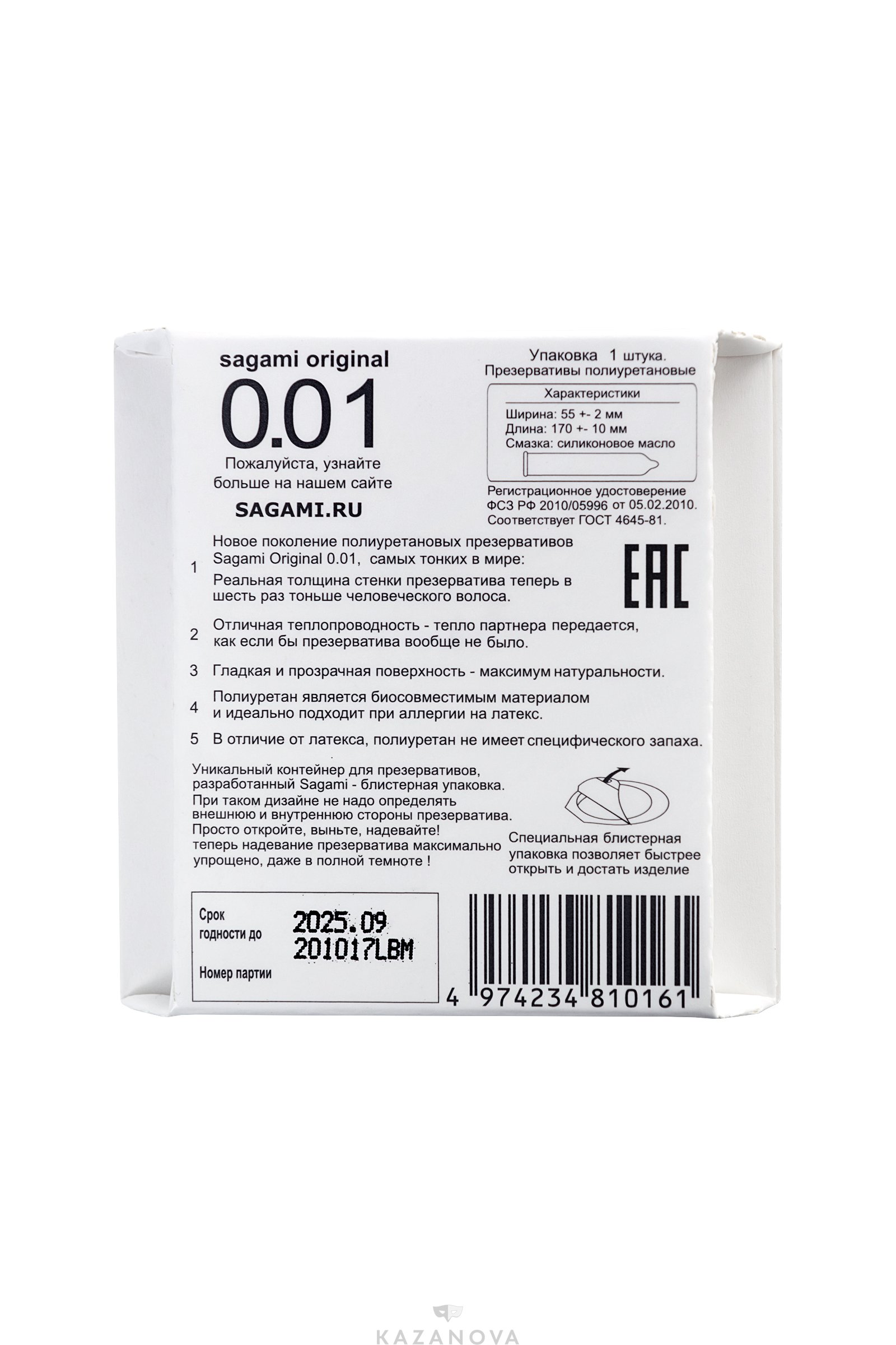 Толщина стенок SAGAMI Original всего 0,01 (для сравнения, толщина стенки обычного латексного презерватива 0,06 мм).