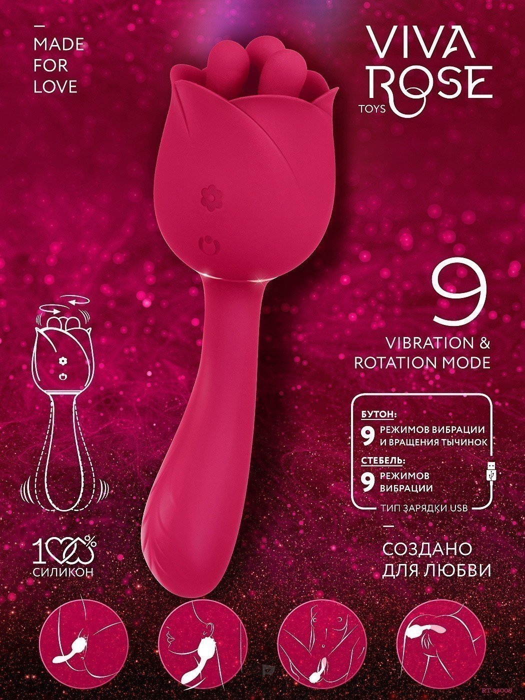 Стебель розы вводится во влагалище или анальное отверстие. Вибрация по всей длине ствола усиливает возбуждение и доводит до пика удовольствия. Стебель имеет 9 виброрежимов.