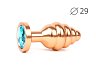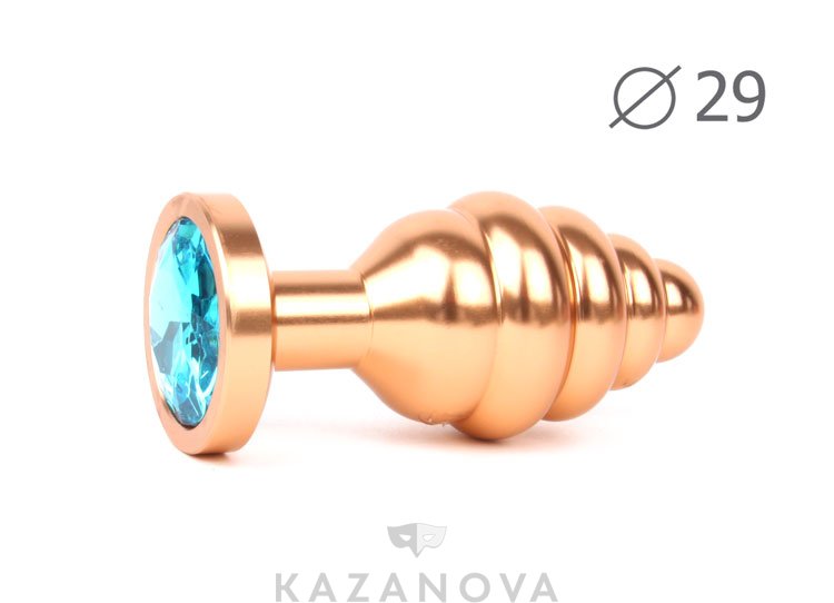 Втулка анальная металлическая малая ребристая золотая c бирюзовым кристаллом