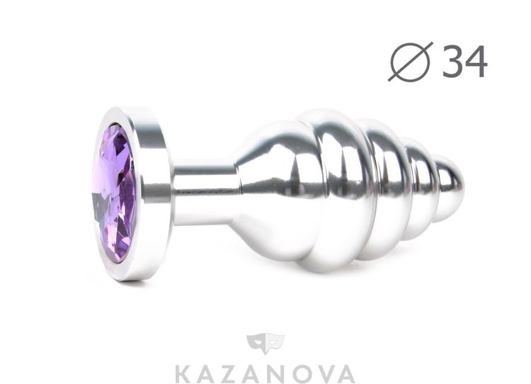 Втулка анальная металлическая средняя ребристая серебристая c лиловым кристаллом
